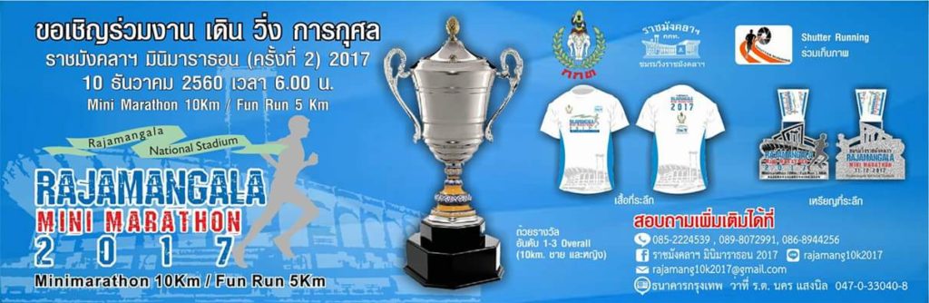 กลับจากงาน Surat Half Marathon 2017  เมื่อวันที่ 3 ธันวาคม ที่ผ่านมา ผมกลับมาจากนครศรีธรรมราช ถึงกรุงเทพ ฯ วันที่ 9 ธ.ค. และวันที่ 10 ก็มีงานวิ่งต่ออีกงาน คืองาน  Rajamangala Mini Marathon 2017 งานนี้เป้นงานที่สมัครงานสุดท้ายของปี 2560 เป็นมินิมาราธอนที่ 14 งานนี้จัดโดย หน่วยงาน: การกีฬาแห่งประเทศไทยและชมรมวิ่งราชมังคลาฯ กกท.