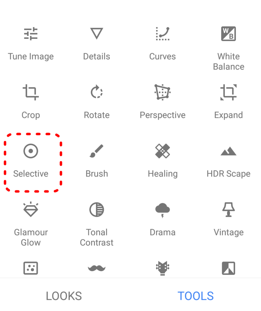 2. เปิดแอป snapseed ขึ้นมา จากนั้นเลือกรูปที่เราต้องการแก้ไข อ๋อ เดี๋ยวขออธิบายฟังก์ชั่นนี้ก่อน ตัวที่เราจะใช้นี่ก็คือ Selective หรือถ้าภาษาไทย ปรับเฉพาะส่วน คือเป็นการปรับแสงเฉพาะส่วน การปรับจะมีให้เลือกปรับ 4 แบบ คือ