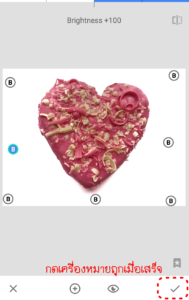 เมื่อปรับเป็นที่พอใจแล้ว ก็กดเครื่องหมายถูกที่อยู่มุมล่างขวา จากนั้นเราก็บันทึก หรือสามารถแชร์ไปที่แอปอื่น ๆ หรือจะแต่งรูปต่อ เช่นใส่ตัวหนังสือ หรืออื่น ๆ ต่อได้