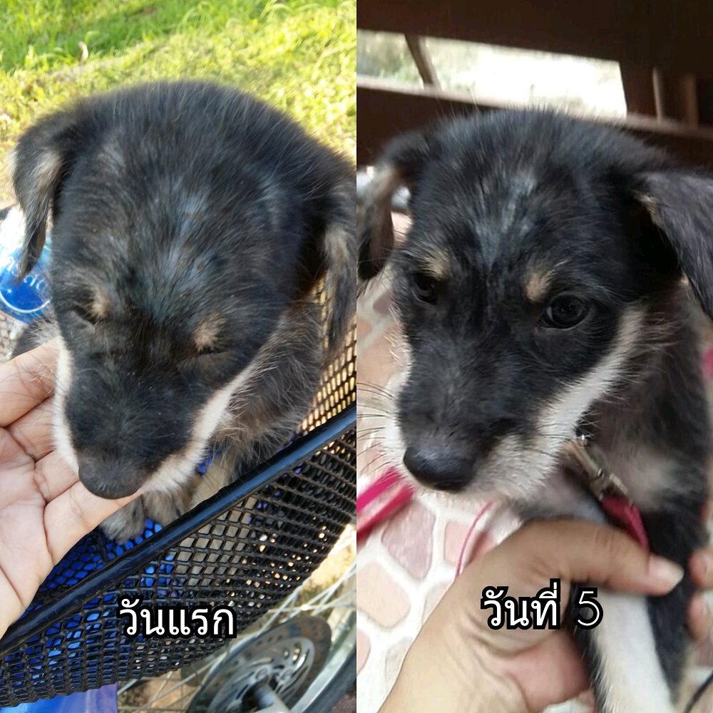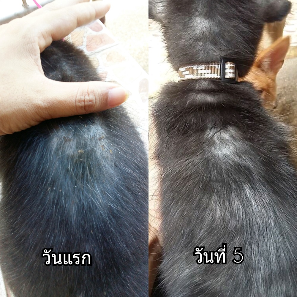 วันแรกที่นำมาบ้านเราจัดการอาบน้ำ กำจัดหมัดหมาเหมือนที่เล่าให้อ่านแล้วครั้งก่อน หลังจากนั้นอีก 2 วันช่วงกลางวันเราก็ยังคงหาไข่ของหมัดหมาให้อยู่เรื่อย ๆ ดูแลแผลตามตัวเจ้านำโชคที่เกิดจากน้ำลายของหมัดหมา จนน้องมีสภาพที่ดูดีขึ้น แต่ขนยังบางอยู่เพราะว่าหลุดร่วงจากแผลเยอะเหมือนกัน